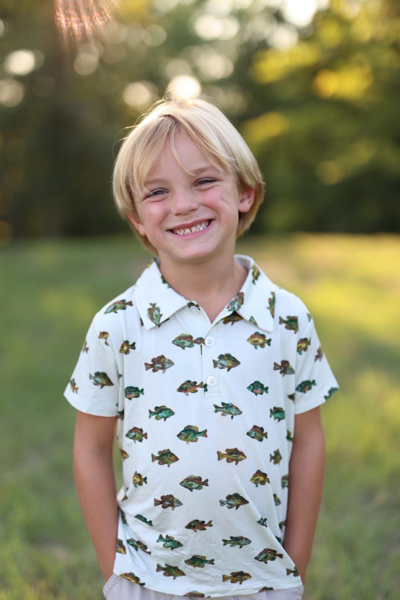 This Freshwater Fish Bamboo Polo is the perfect catch for your little outdoorsman. Matching Baby Brother Items available.